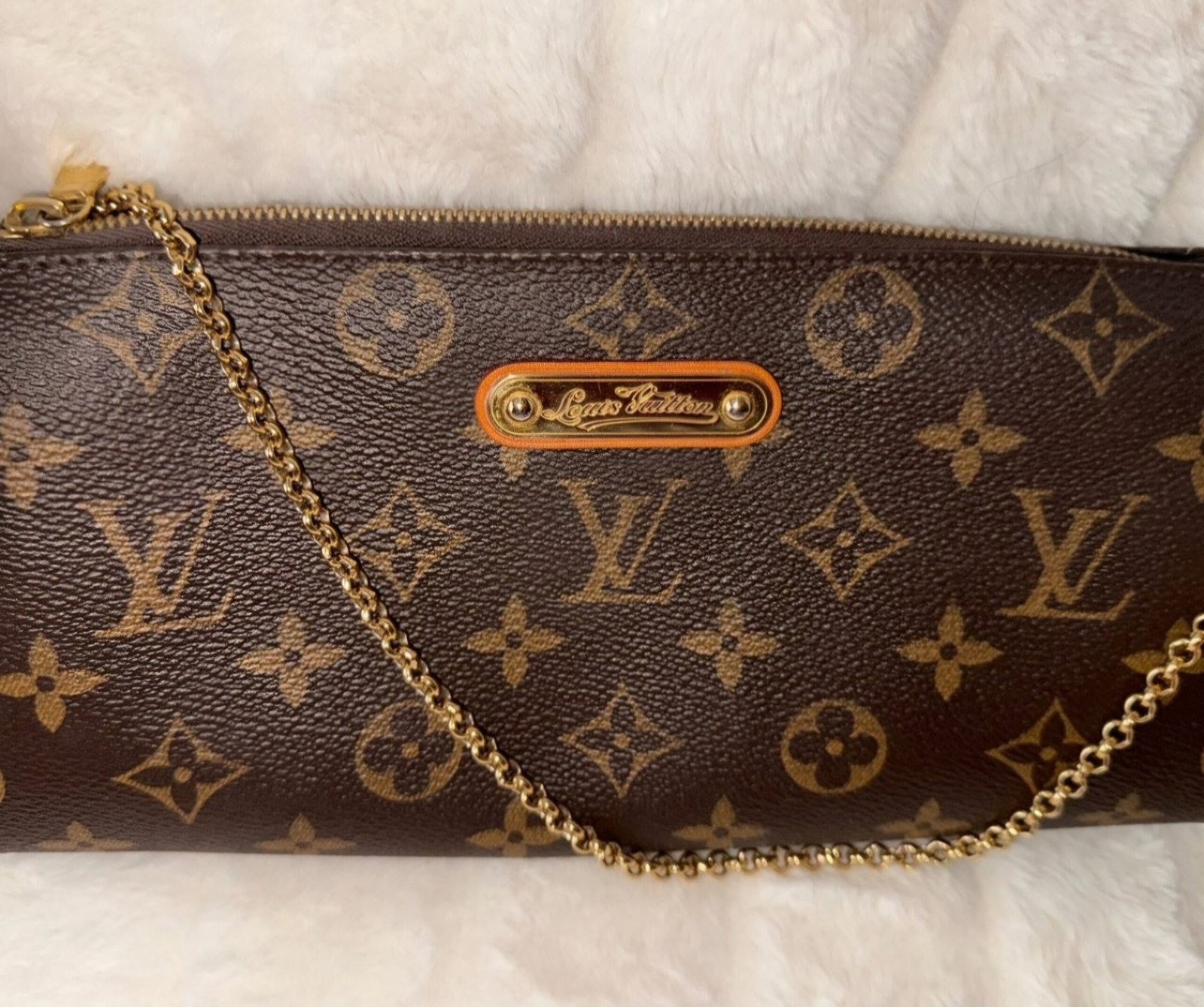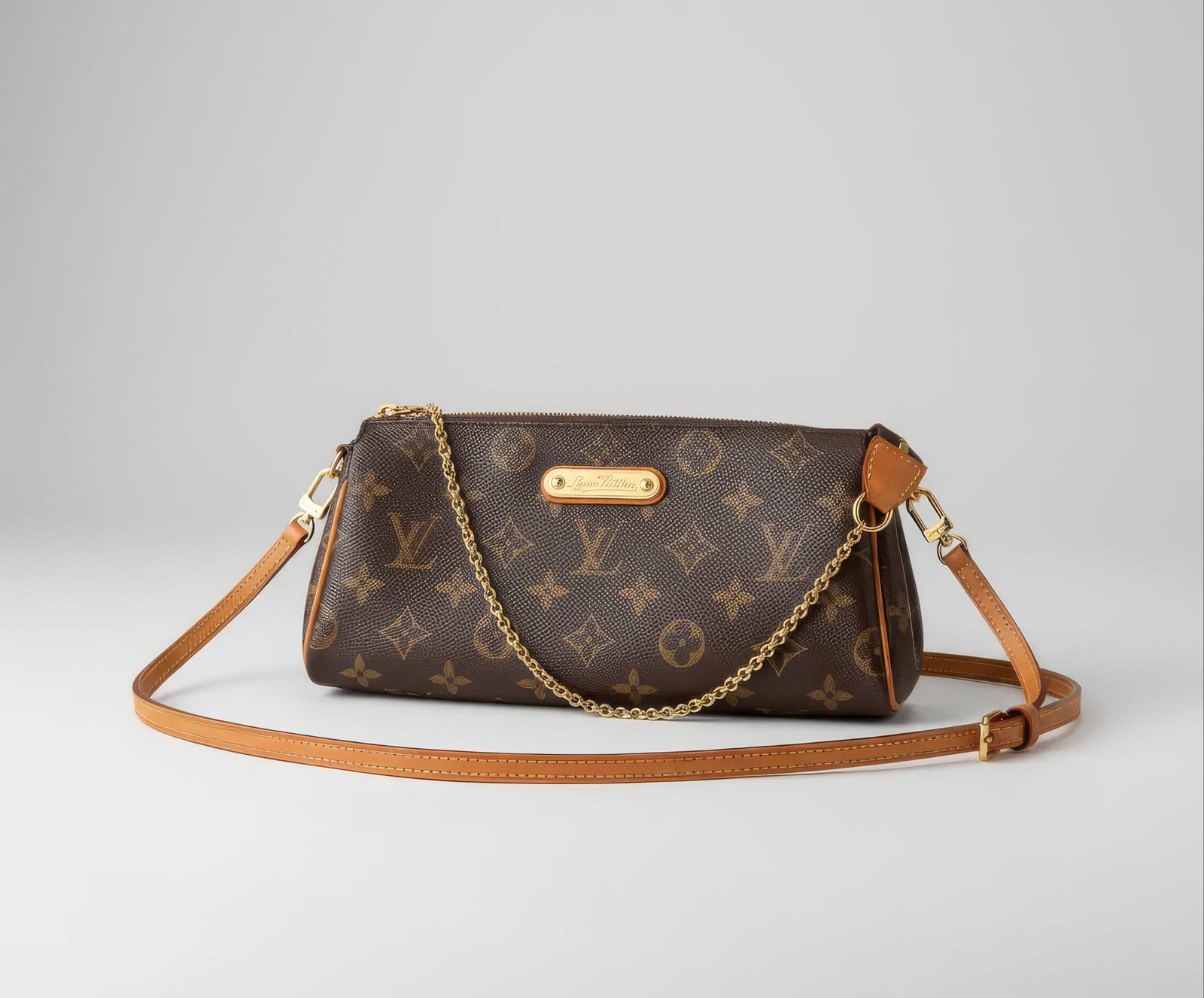 The Louis Vuitton Eva Pochette is a timeless accessory crafted in the iconic LV Monogram canvas. This piece includes both a removable leather crossbody strap and a polished gold-tone chain for shoulder or handheld wear. It is ideal for events, casual outings, or travel — stylish yet practical.