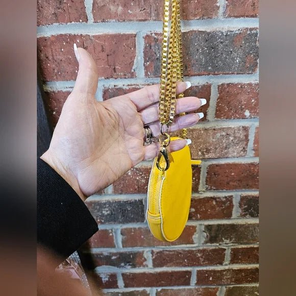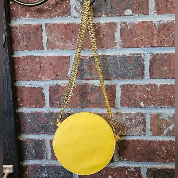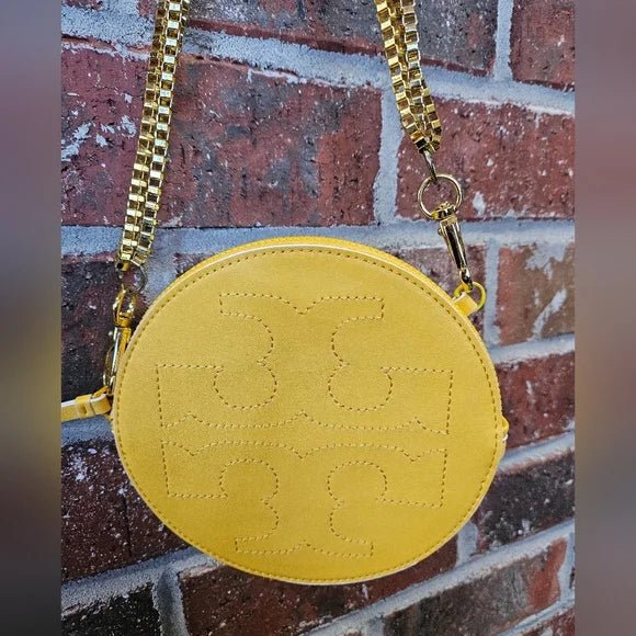Authentic Tory Burch round crossbody bag in vibrant yellow with a gold-tone chain strap. A stylish everyday piece perfect for adding a pop of color to any outfit.